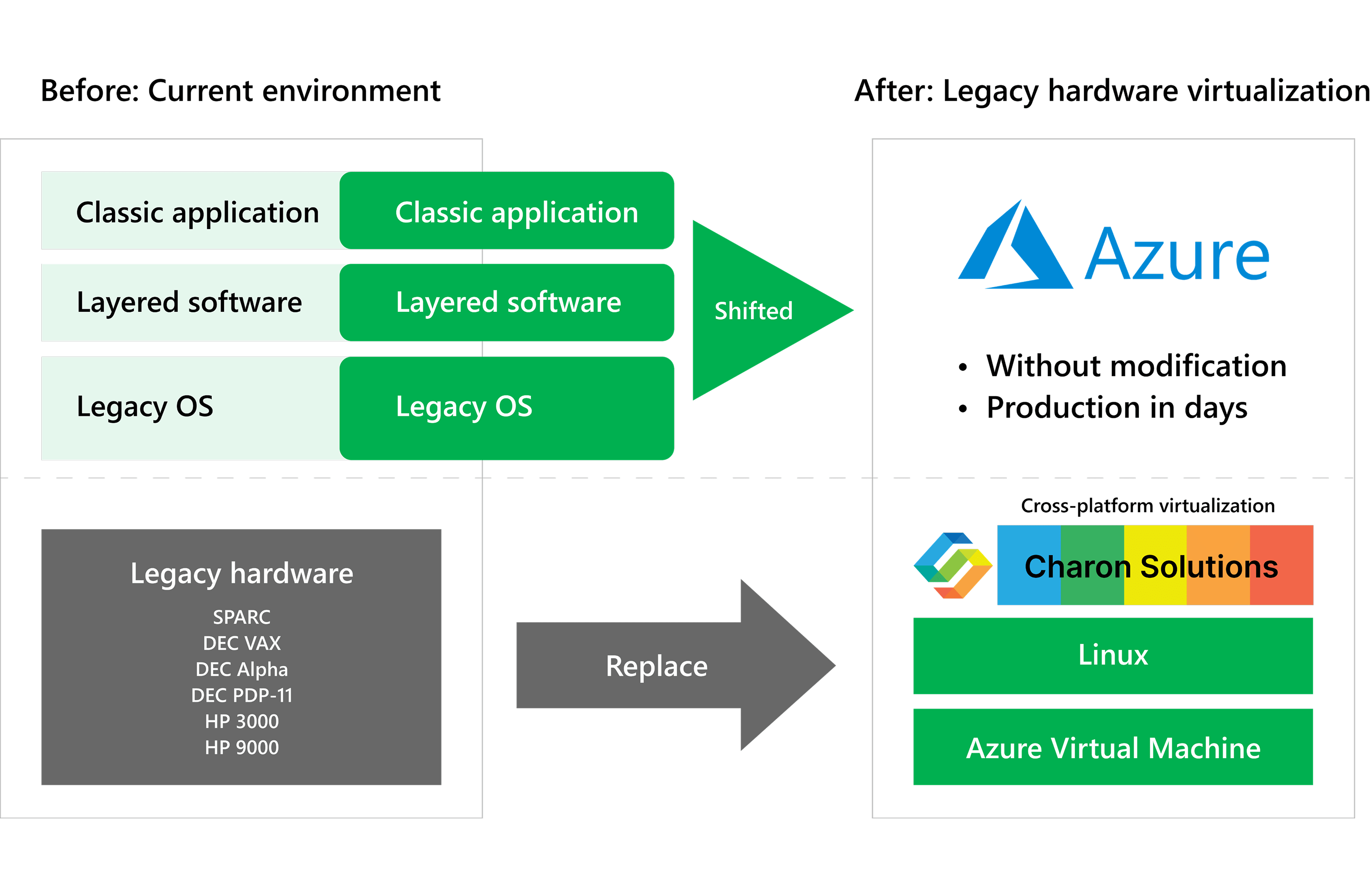 Charon rehosts your application on Azure and builds a bridge between your on-premises datacenter and the cloud. It creates a virtual legacy hardware layer on Azure-hosted x86-64 systems. Could migration to Azure allows unmodified VMs to run with dedicated networking, secure storage, and seamless management.